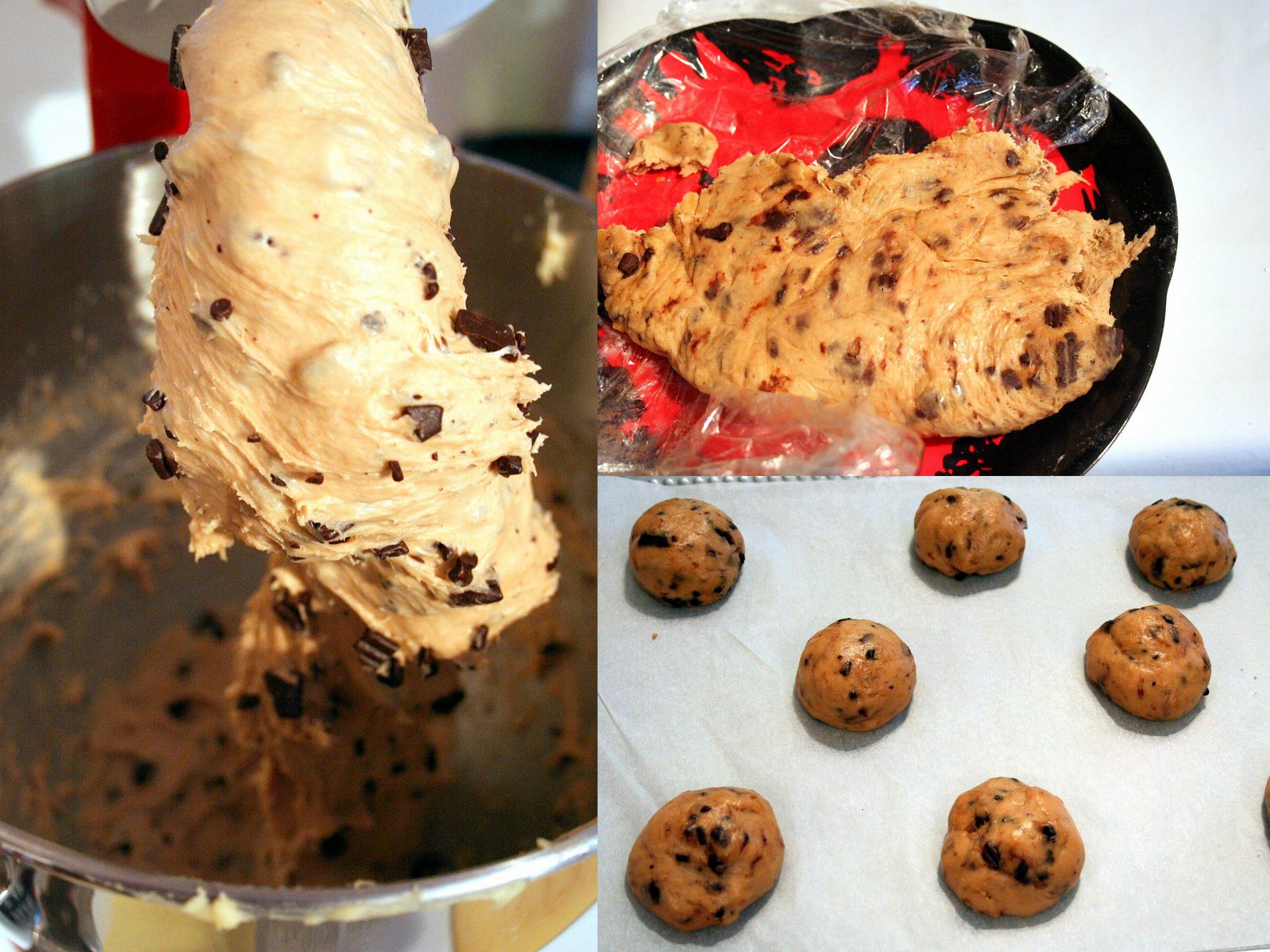 Ils sont nés d’une erreur de ma part…je voulais faire les pains au lait hamburger de Christophe Felder, mais la pâte n’a jamais cessé de coller au batteur, ça m’a énervée, j’ai voulu transformer en brioche aux pépites de chocolat, mais j’ai mis des bouts de choco trop gros, et comme j’avais mis l’accessoire « feuille » du KitchenAid, ce dernier s’est mis à écraser mes pépites contre le bol, les réduisant de moitié en poudre.