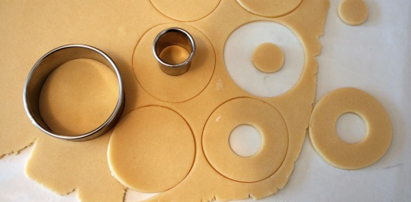 - Une fois la pâte dure et froide, l’étaler sur 3mm d’épaisseur, et découper des disques à l’aide de 2 emporte-pièces : un pour faire le disque, un plus petit pour faire le trou (voir photo)